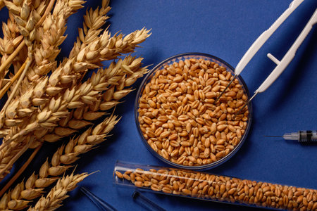 Wheat grain and wheat ears on a laboratory table. testing of grain quality and pesticides trace. top view. Genetic Modification Study in Agricultural Wheat. Agricultural Research