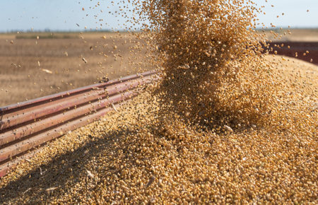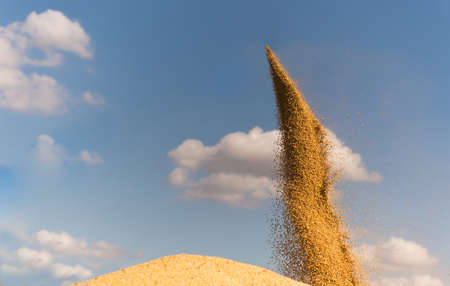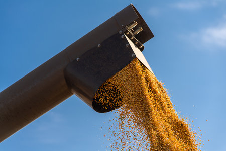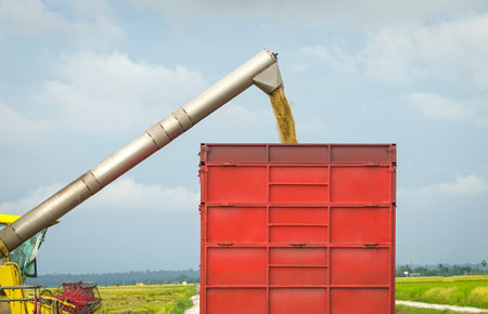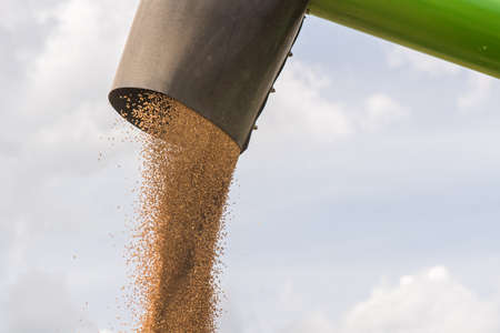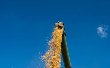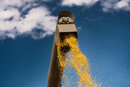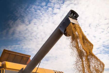 Unloading of harvester into tractor-trailer for selling. Pouring grains from unloader pipe into a yellow tractor during the daytime. Concept of transportation and selling. Blue cloudy sky