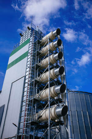 Agricultural Silos. Building Exterior. Storage and drying of grains, wheat, corn, soy, sunflower against the blue sky with white clouds