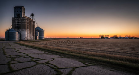 Rural showing grain silos and rural landscape at sunset with cracked paved road in foreground. resolution use.