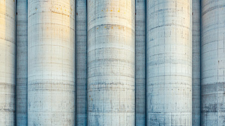 Explore the intricate textures of concrete silos illuminated by natural light. This image captures industrial design, emphasizing vertical lines and weathered surfaces.