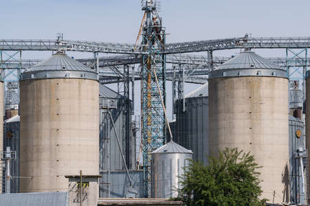 A large modern plant for the storage and processing of grain crops. view of the granary on a sunny day. Large iron barrels of grain. silver silos on agro manufacturing plant for processing and drying.