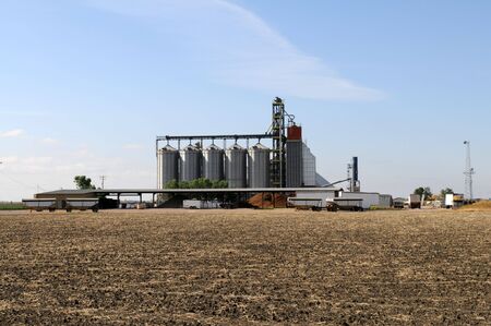 a set of silos for processing agricultural products next to a field.ai generative
