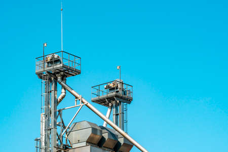 Modern granary elevator and seed cleaning line. Agro-processing and manufacturing plant for storage and processing drying cleaning of agricultural products, flour, cereals and grain.