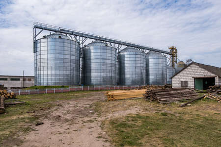 Agricultural Silo. Set of storage tanks cultivated agricultural crops processing plant. Storage and drying of grains, wheat, corn, soy, hay.