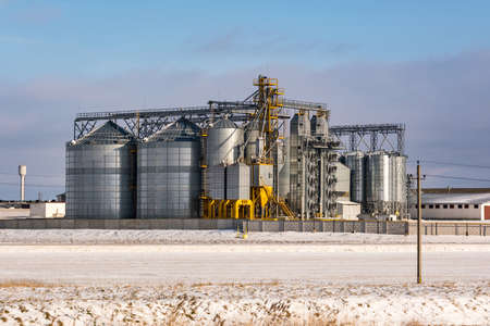 agro silos granary elevator in winter day in snowy field. Silos on agro-processing manufacturing plant for processing drying cleaning and storage of agricultural products, flour, cereals and grain.