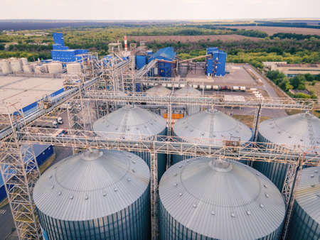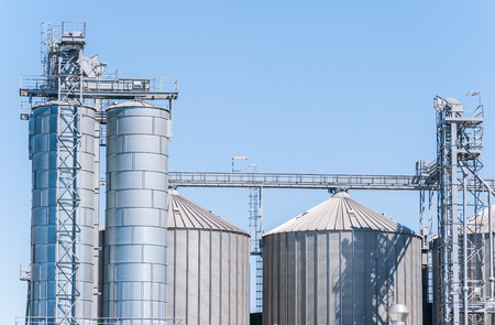 Modern granary elevator. Silver silos on agro-processing and manufacturing plant for processing drying cleaning and storage of agricultural products, flour, cereals and grain.