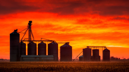 Sunset sky with vibrant orange and red colors behind large grain silos and agricultural storage buildings on flat farmland