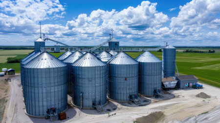Spectacular view of towering grain storage silos against the backdrop of a vast wheat field