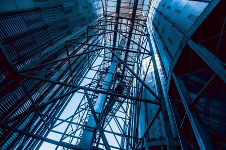 Agriculture facility bin tank and frame girder construction. Sunshine at the evening.