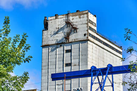 Vintage grain elevator against a blue sky. Agriculture in Russia.