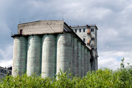 Architecture and details of old grain silos, abstract composition.