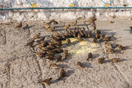 flock of sparrows eating millet in winter