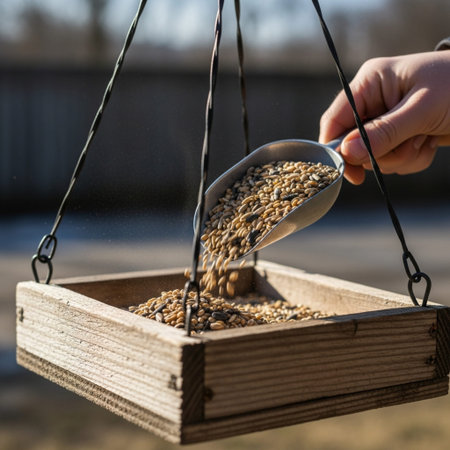 A hand filling up seeds into a bird feeder, winter scene, shallow DOF