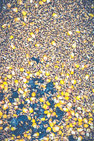 Feed grain mixture. Wheat and corn (maize) grains for animal and bird feed. natural grain background. Natural type of grain mixture with natural garbage.