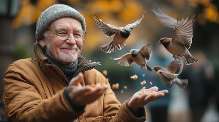 Man feeds birds with bread from his hands