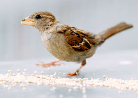 Close-up of a sparrow eating millet grains on a neutral background
