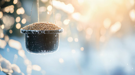 Hanging Bird Feeder with Seeds Covered in Frost on Winter Morning. Concept of Wildlife Care, Winter Feeding, Bird Conservation, Seasonal Nature, Outdoor Backyard Habitat, Frosty Morning Light.