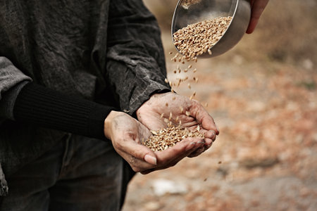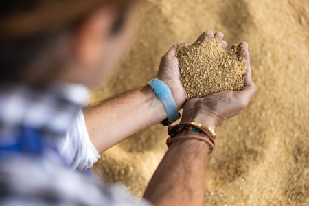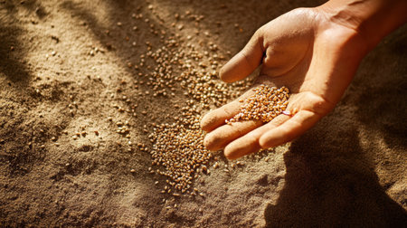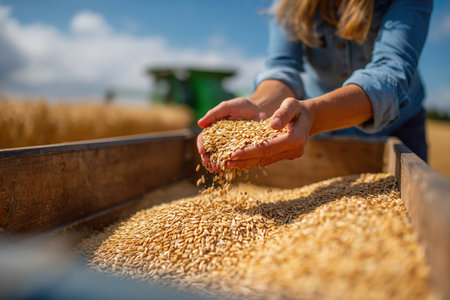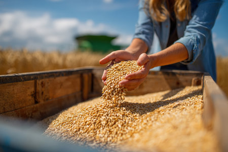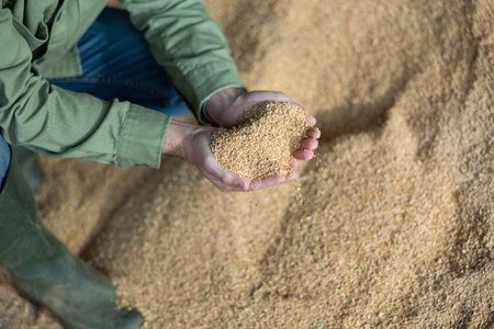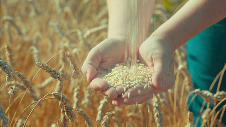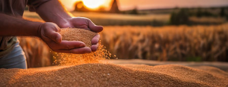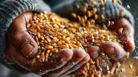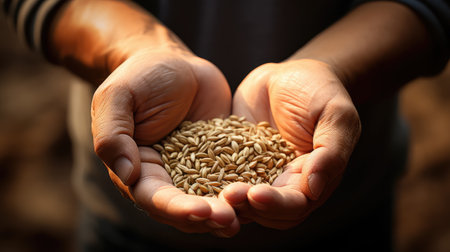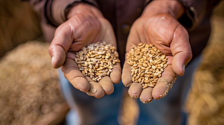 Detailed close-up of golden wheat grains in a farmer's hands, highlighting the natural beauty and the farmer's connection to their crop.