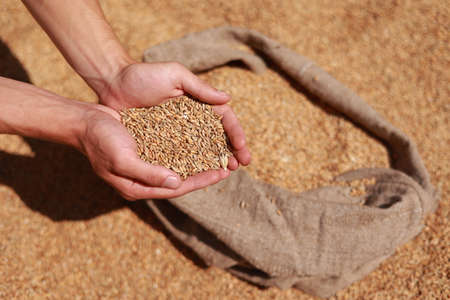 Farmer holding wheat grains in his hands. Harvest.