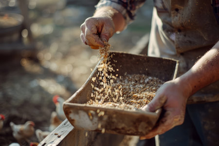 Farmer pours feed into a bucket while chickens gather around. Rural life and farming