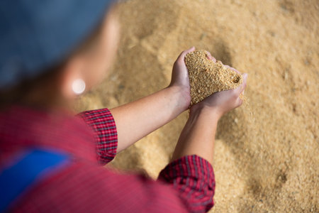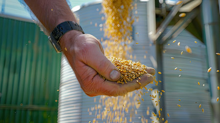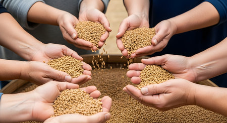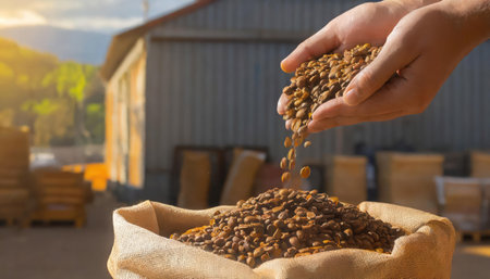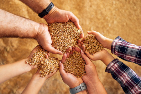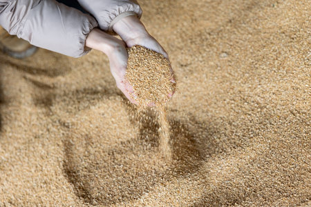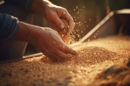 Hands full of golden wheat grains reflect the hard work of the rural harvest as workers prepare in a large, bright warehouse.