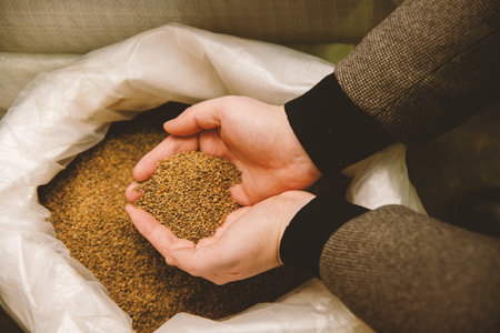 Male hands from which ground malt pours out. good attitude to craft. Craft beer brewing from grain barley pale malt in process.