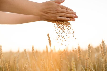 Farmer hand with wheat grains on wheat field at sunset, closeup