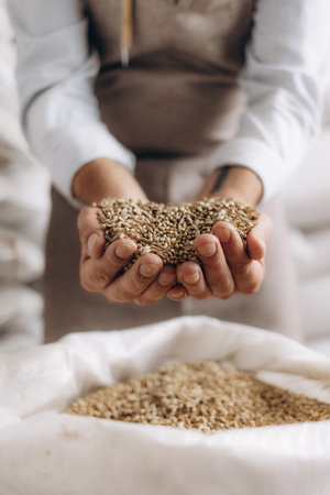 Natural ingredients for brewing best craft beer in modern plant. Millennial brewer with tattoos holds wheat or barley grains in his hands over white bag, side view, cropped, free space
