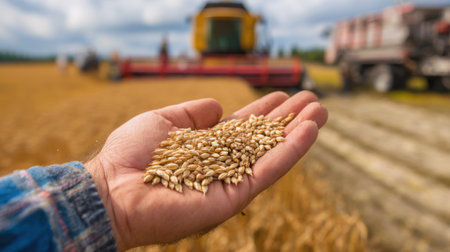 Farmer hand holding golden wheat grains, with a blurred field in the background. represents harvest, agriculture, food, and natural abundance.