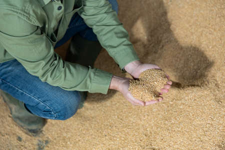 Farmer holding a handful of wheat grains in hand, closeup view.