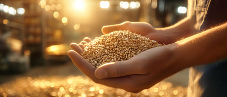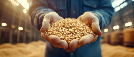 Rural worker proudly displays a handful of golden wheat grains in a brightly lit warehouse, emphasizing the beauty of autumn harvests.