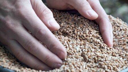 Harvest, close up of farmer's hands holding wheat grains against the background of grain