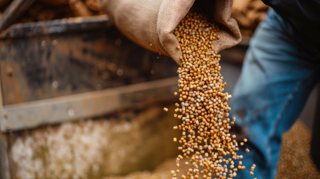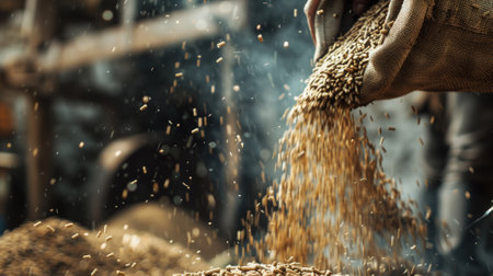 Dive into the world of agriculture with this close-up image capturing the moment grains are poured onto the processing floor in a bustling facility.