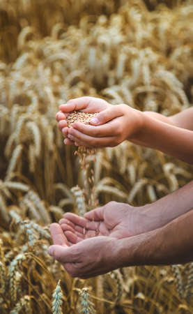 A man farmer holds wheat grain in his hands in a wheat field. Selective focus. Nature.