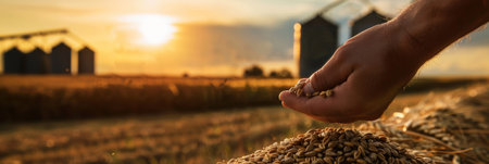 Golden Hour Grain Harvesting Scene with Hand Holding Wheat Kernels.