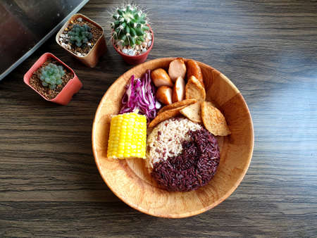 Health food: Cooked rice berry and brown rice with fried Vietnamese pork ham, German Sausage, boiled corn and red cabbage in the wooden bowl on the table near cactus and succulents pots.