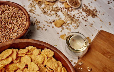 Stack of Healthy High Fiber Prebiotic Grains including wheat bran cereal, oat flakes and pearl barley, on rustic dark wood table background.