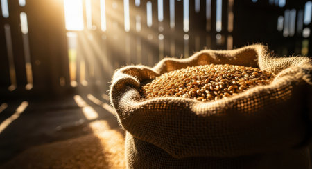 Burlap sack overflowing with golden wheat grains, illuminated by bright sun rays streaming into a rustic wooden barn. represents harvest, agriculture, and natural food.