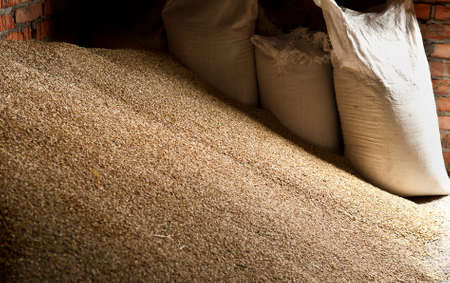 Wheat grains in sacks at mill storage