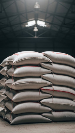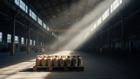 Stacked sacks in warehouse, industrial lighting, symmetrical composition