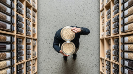 This image captures a detailed aerial view of agricultural machinery transporting grain inside a rustic warehouse, showcasing the efficiency of food production processes.