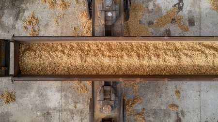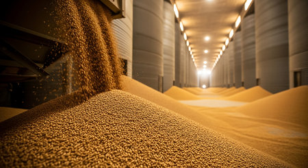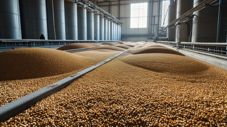 Dive into the world of agriculture with this close-up image capturing the moment grains are poured onto the processing floor in a bustling facility.