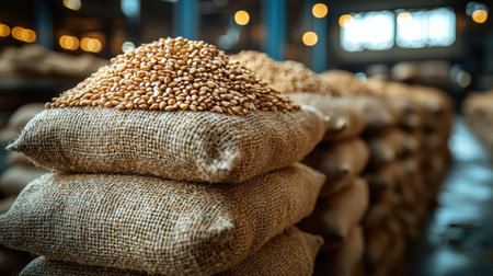 A striking image of a pile of burlap bags filled with grain, showcasing textures and tones in a deserted industrial space, perfect for agricultural themes.