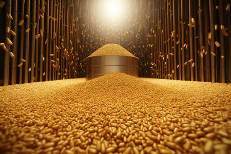 Golden grains surrounded a silo. A high quality image making by generative ai.