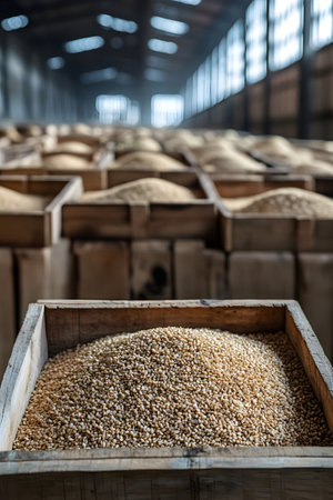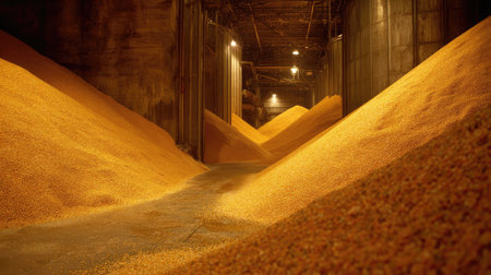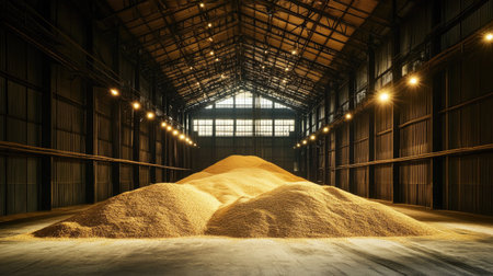 A spacious industrial warehouse filled with heaps of grain, featuring warm lighting and a rustic atmosphere. Ideal for agricultural and storage themes.
