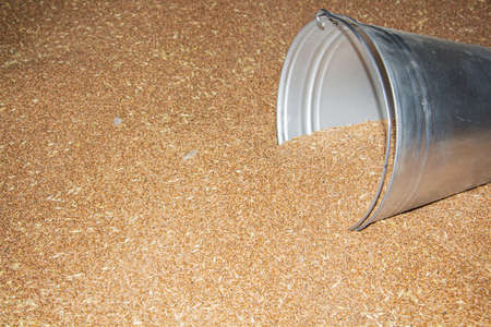 wheat is put in a large pile during grain harvesting and in a metal bucket