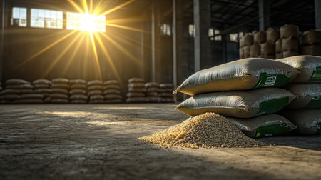 A warm sunbeam illuminates a spacious warehouse filled with stacked bags of grain, with some grains spilled on the concrete floor, highlighting agriculture themes.