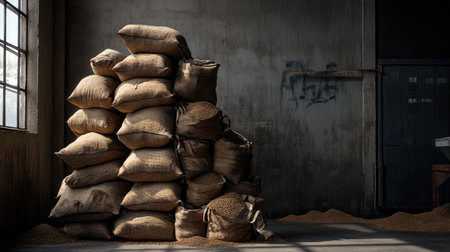 An evocative scene of burlap bags stacked in an industrial warehouse, showcasing the rustic charm of aging architecture and materials. Perfect for evoking themes of agriculture and storage.