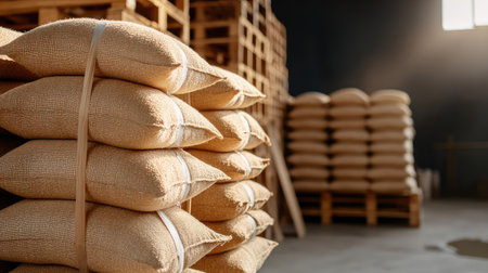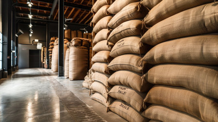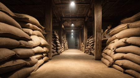 A captivating view of a spacious warehouse interior featuring neatly stacked burlap bags, dim lighting, and a rustic atmosphere, perfect for industry themes.